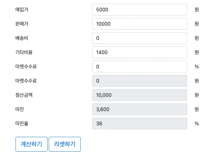 아주 좋은 마진 계산기가 여기 있습니다.(저희도 만들고 있으니 곧 때깔나는 마진계산기로 업데이트 해보겠습니다)