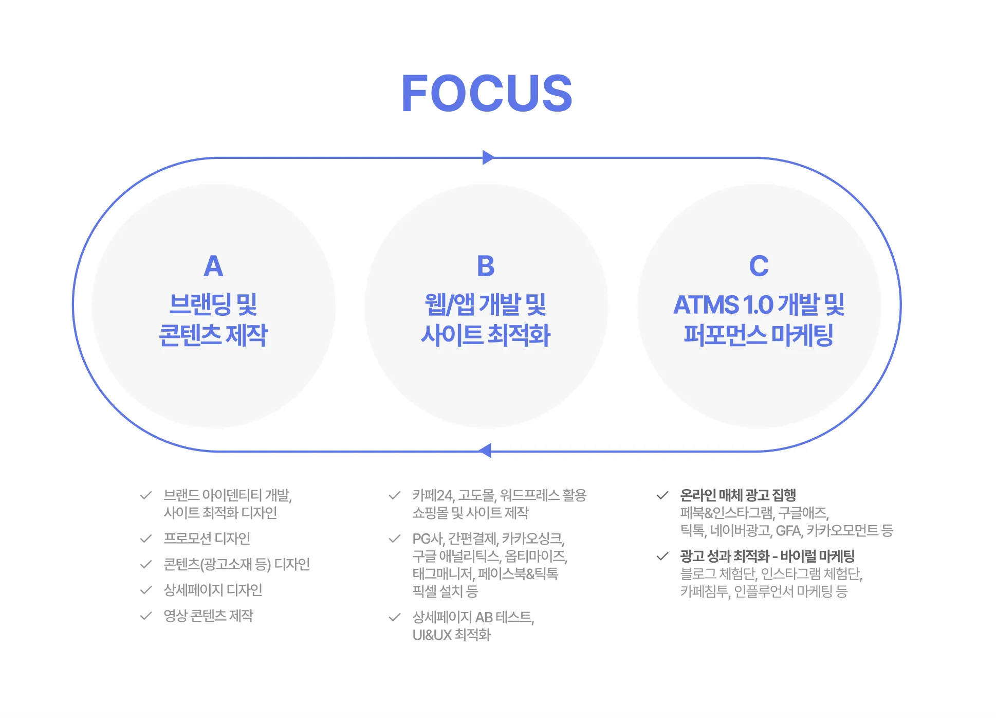 파트너사의 온라인 비즈니스를 돕는 마케팅 중심 종합 에이전시 입니다.